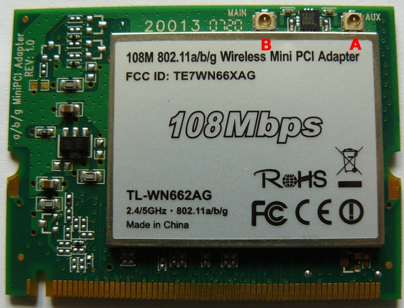 Většina miniPCI radiových karet, které používáme, má dva anténní konektory. Jelikož nikdy nevim, kam co u které karty, udělal jsem si obrazky karet s popisem antenních konektorů...